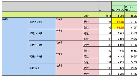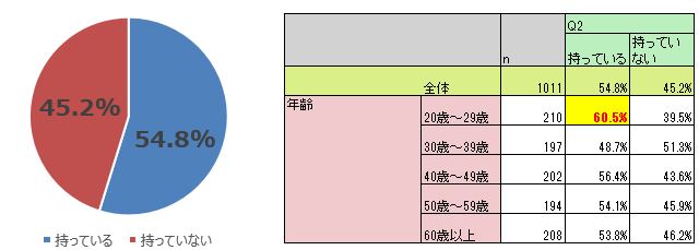 また、「持っている」と回答したのは全年代の中で20代が最多で60.5%と、「持っていない」と回答した39.5%をはるかに上回る割合でした。所有率が高いのは次いで40代が56.4%、50代が54.1%という結果でした。
