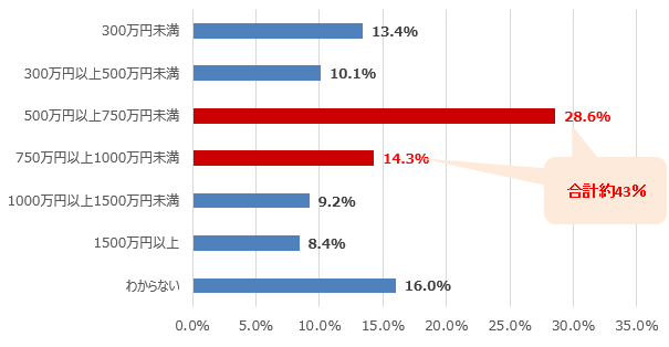 質問5 質問1で「持っていない」と回答した方にお聞きします。「この金額ならマイカーを購入したい(できる)」と思える金額はいくらですか。選択肢から1つ選んでください。(単一回答:n=457)