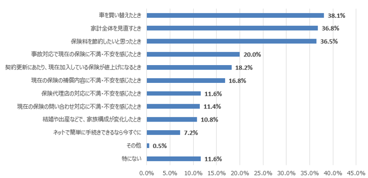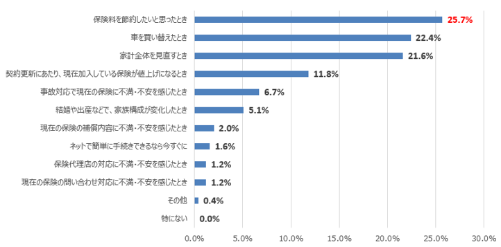5.保険料見直しのタイミングのトップ3は「保険料を節約したいと思ったとき」「車を買い替えたとき」 「家計全体を見直すとき」!
